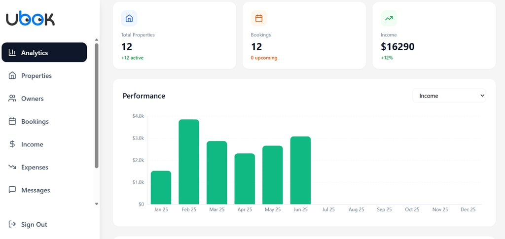 Nous mettons à votre disposition un tableau de bord en ligne moderne et intuitif. Grâce à cet outil, vous pouvez suivre en temps réel les performances de votre logement — taux d’occupation, revenus, réservations, dépenses et bien plus encore — sans attendre le rapport de fin de mois.